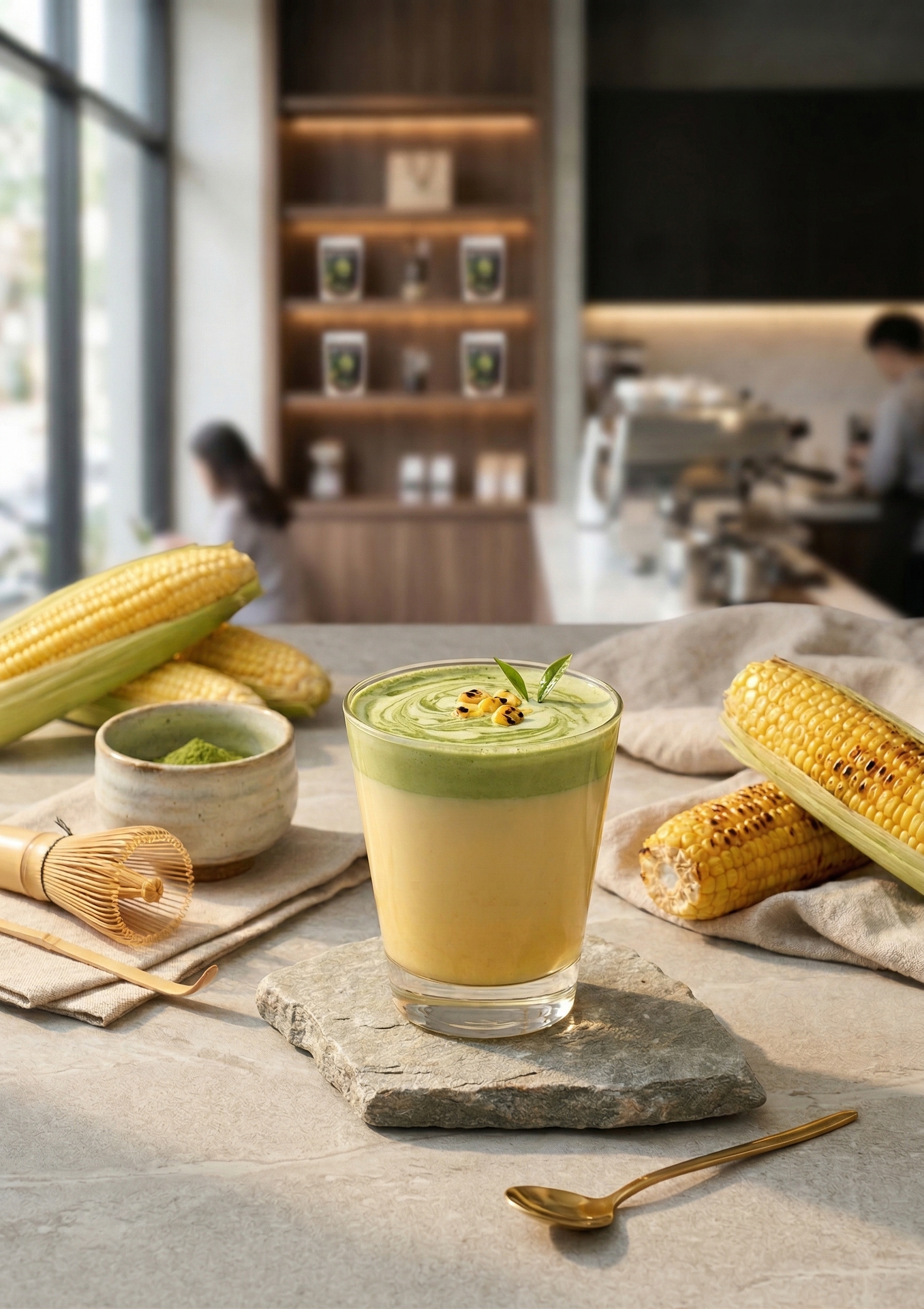 Còn với kem matcha, đây là phần tạo nên chất “bắt trend” mạnh nhất của ly. Người uống thường cảm nhận kem matcha trước cả khi cảm nhận rõ thân nước bên dưới. Vì vậy lớp kem này phải đẹp, mịn và có hậu vị sạch. Một lớp kem matcha lý tưởng nên có màu xanh dịu, không quá đậm kiểu xanh thực phẩm, không quá nhạt đến mức mất nhận diện. Khi đưa lên môi, lớp kem cần tan chậm, có độ sánh vừa đủ để bám nhẹ rồi hòa vào nền bắp bên dưới. Chính khoảnh khắc giao nhau giữa lớp kem xanh và phần thân vàng là điểm tạo nên nét riêng của món.